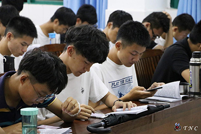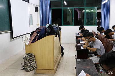 在这个晚上,18级的新生们都在认真地进行他们来到大学的第一场考试。沙沙作响的翻书声让原本安静的课室充满了活力。他们认真翻《学生手册》的样子让巡堂的辅导员倍感欣慰。