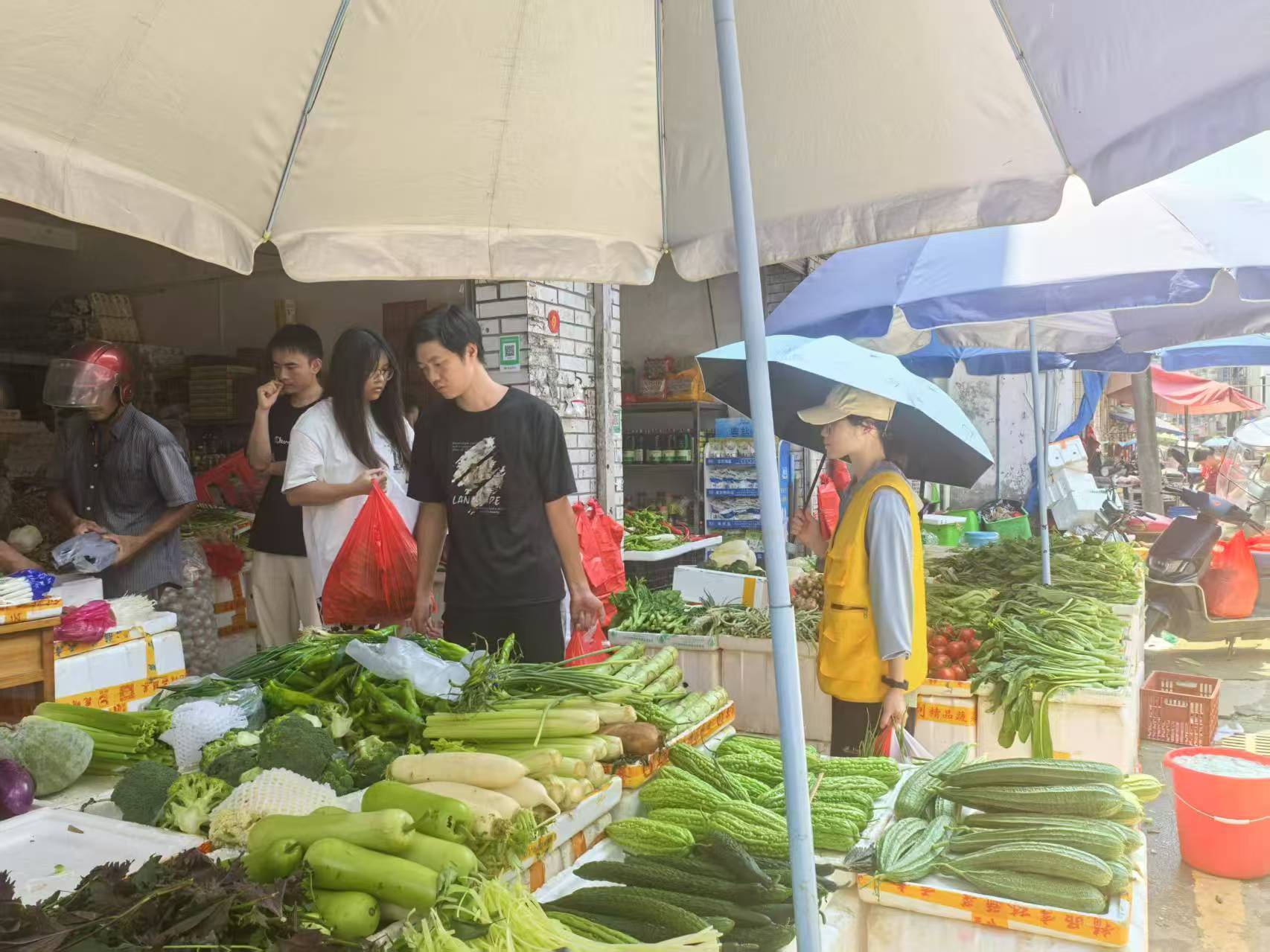 离开杨桃园后,实践队来到了麻榨镇的菜市场。此时的菜市场热闹非凡,各个摊位前都摆满了新鲜的蔬菜、水果、肉类等商品,摊主们的吆喝声、顾客的讨价还价声此起彼伏,充满了浓浓的市井烟火气。