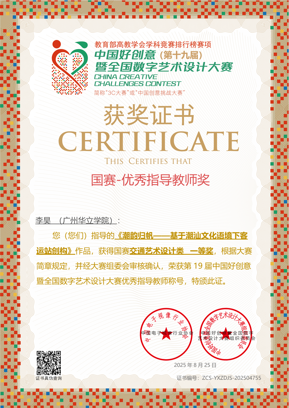 近日,A类竞赛第19届中国好创意暨全国数字艺术设计大赛(简称“3C大赛”)获奖名单正式公布。在广州华立学院城建与资源勘探学院陈秋帆博士的精心组织与指导下,我院学子在本届大赛中表现优异,荣获国家级、省级奖项多项,实现了我校在该项赛事中国赛一等奖重大突破,充分展现了我院在数字艺术与设计教育方面的深厚底蕴与创新实力。