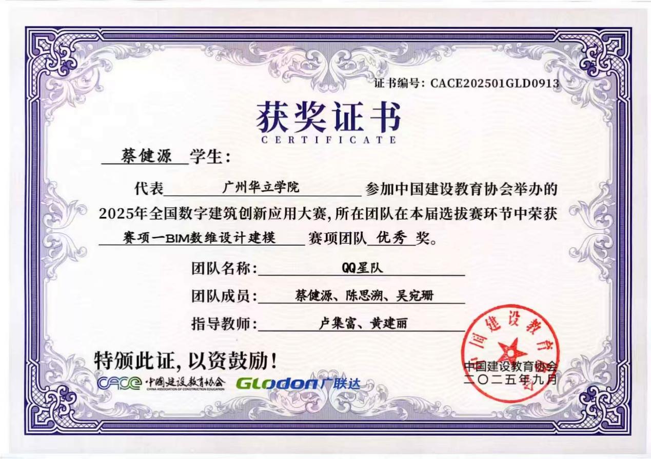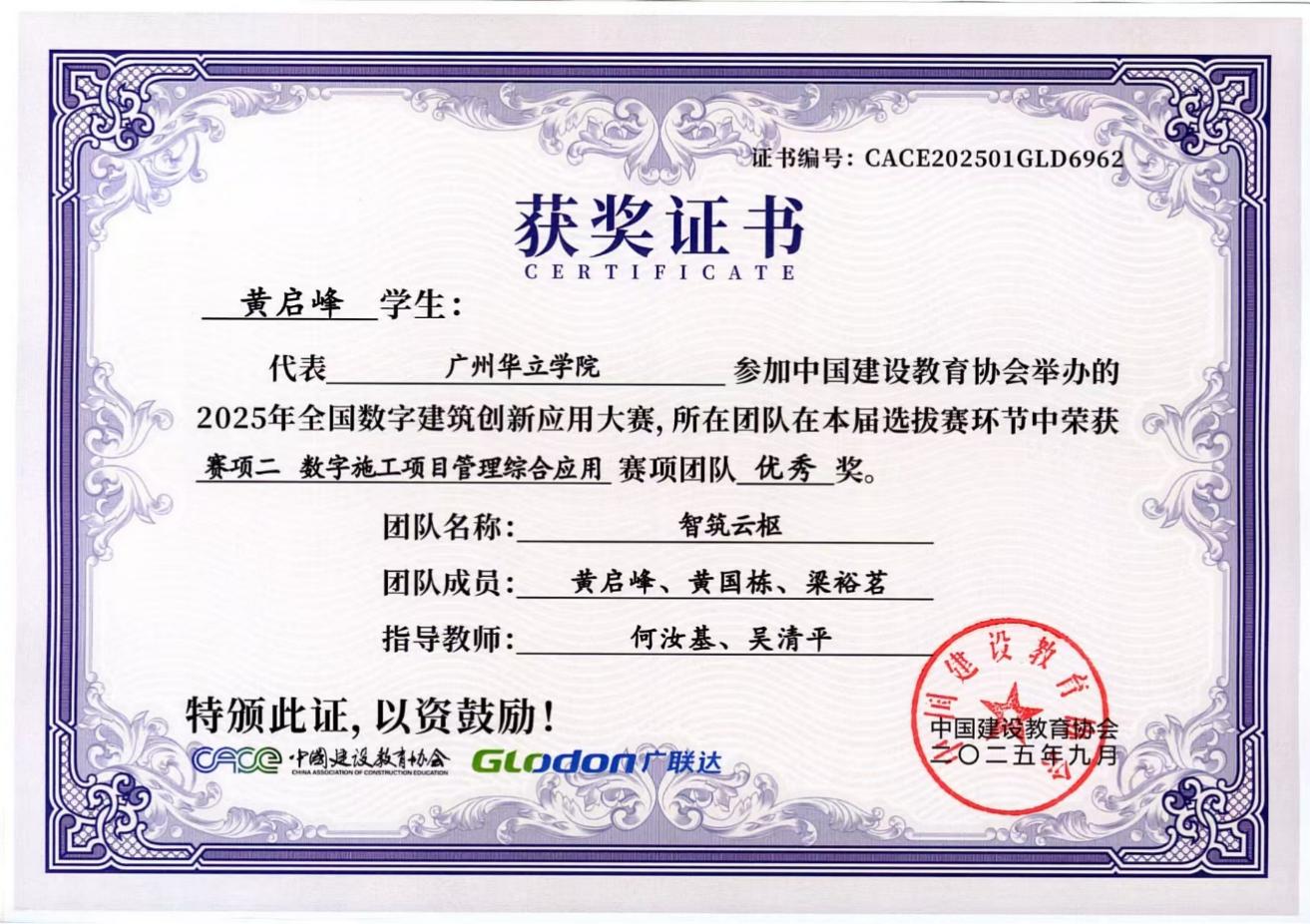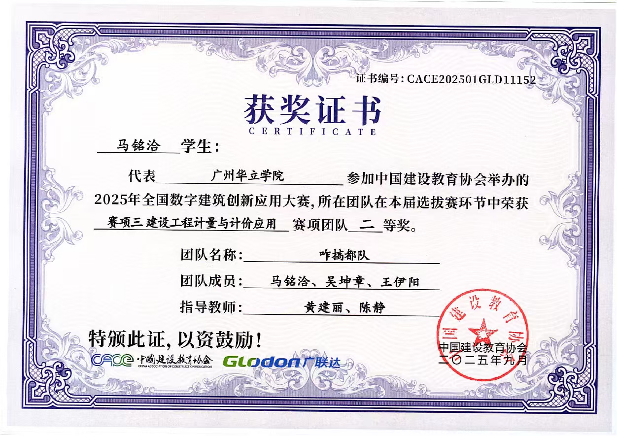 在具体赛项中,我院学子表现突出:“项目一 BIM数维设计建模”赛项荣获3个优秀奖;“项目二 数字施工项目管理综合应用”赛项收获1个三等奖与2个优秀奖;“项目三 建设工程计量与计价应用”赛项更是斩获一等奖、二等奖、三等奖各1项。同学们凭借扎实的专业基础、精湛的技术应用与出色的设计方案,赢得了评审专家的一致认可。以下是获奖队伍名称与奖状: