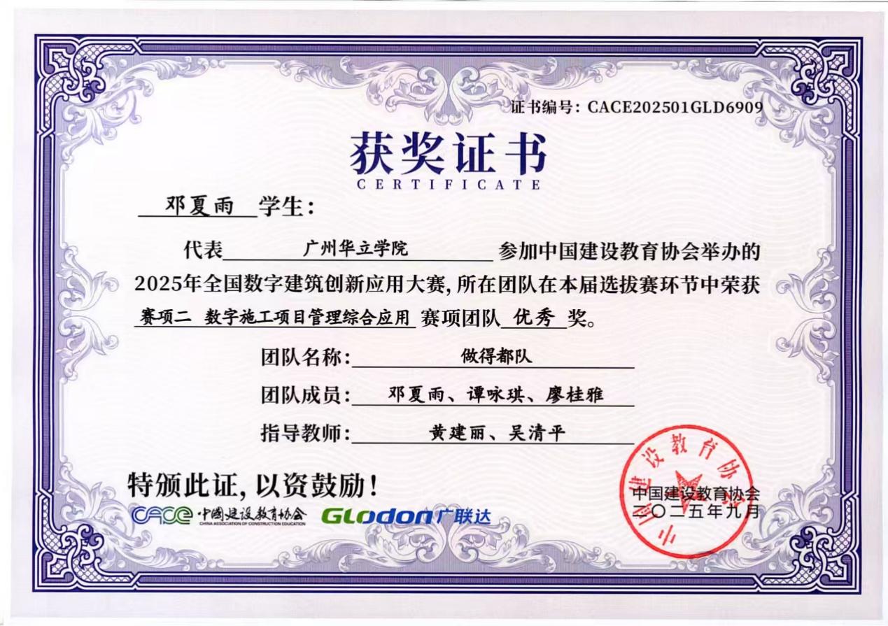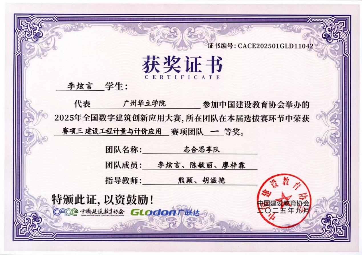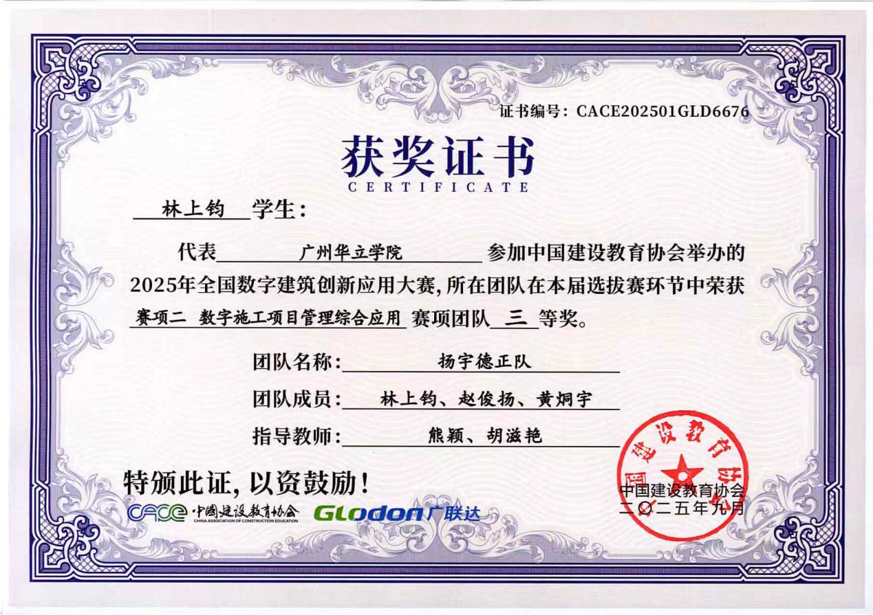 在具体赛项中,我院学子表现突出:“项目一 BIM数维设计建模”赛项荣获3个优秀奖;“项目二 数字施工项目管理综合应用”赛项收获1个三等奖与2个优秀奖;“项目三 建设工程计量与计价应用”赛项更是斩获一等奖、二等奖、三等奖各1项。同学们凭借扎实的专业基础、精湛的技术应用与出色的设计方案,赢得了评审专家的一致认可。以下是获奖队伍名称与奖状: