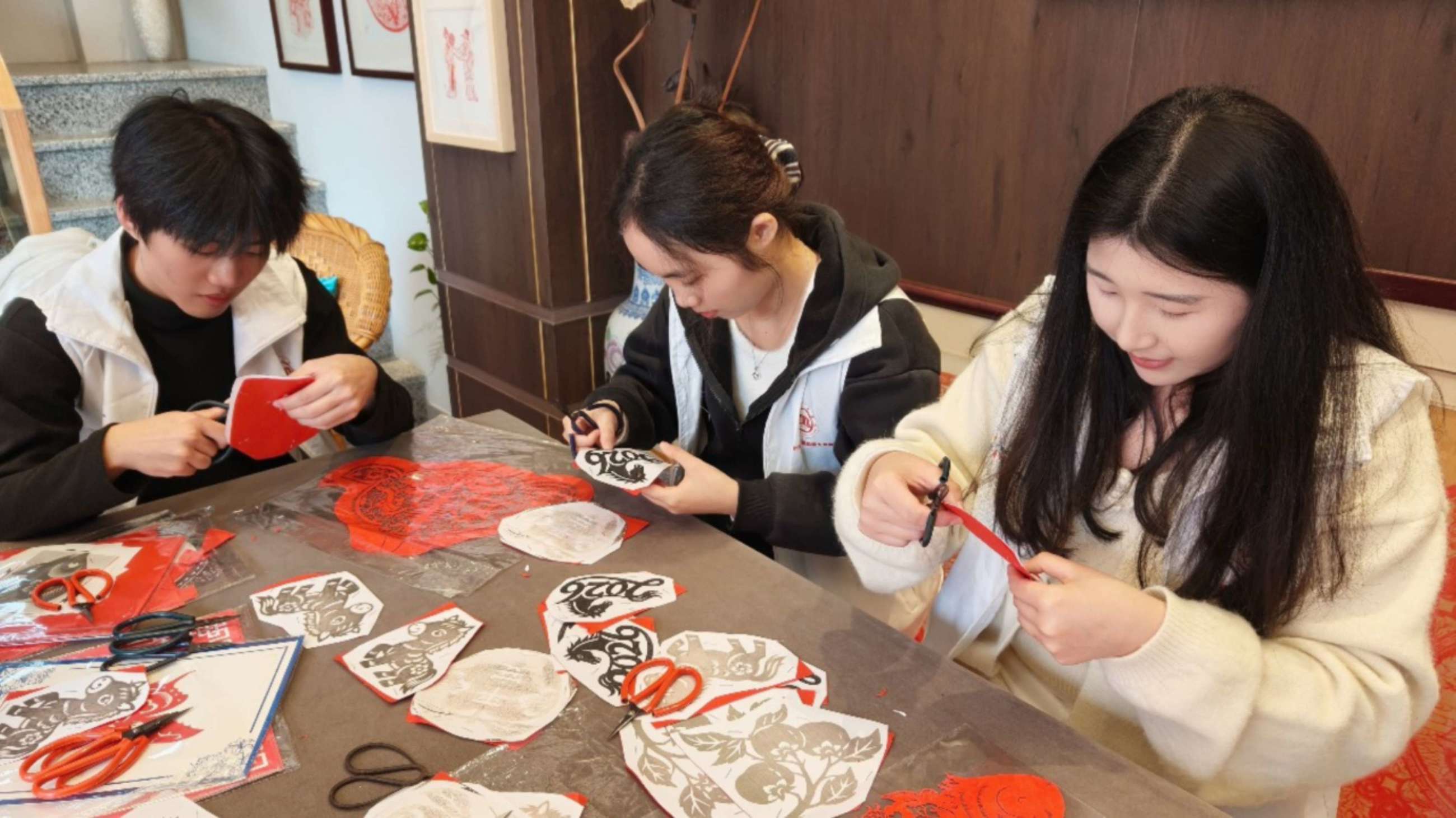 队员们在郑老师的指导下逐步掌握运剪技巧。过程中,针对部分队员“线条卡顿”“纹样松散”的问题,郑老师提出“先描后剪、分段把控”的解决方法,帮助大家突破创作瓶颈。不少队员表示,亲手剪制的过程让他们真切感受到非遗技艺的“指尖温度”,也更理解传承背后的坚守与不易。