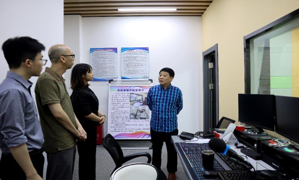 戴剑平院长带领网易电竞和云图动漫的企业代表们参观了传艺学院全媒体实验中心专业实验室群,并按照业界生产流程逐步观览了“摄影摄像工作坊”、“虚拟演播厅”、“录音直播实验室”、“数字影像编辑室”、“融媒体制作中心”,业界专家团队成员对我院实验室内齐全的专业设备给予了充分的肯定。