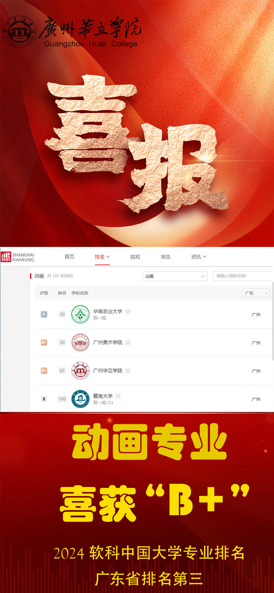 高等教育专业评价机构软科6月13日正式发布了“2024软科中国大学专业排名”,排名结果显示,广州华立学院传媒与艺术设计学院动画专业继续喜获“B+”成绩,广东省2024软科中国大学专业排名分别为:华南农业大学为第一名(A级),广州美术学院为第二名(B+级),广州华立学院为第三名(B+级),暨南大学为第四名(B级),广东财经大学第五名(B级),广东技术师范大学第六名(B级),广东省内与我校获得同一级别是广美,华立学院动画专业位列全省第三(为B+级)。软科中国大学专业排名于2021年首次发布,排名覆盖93个专业类的800多个本科专业,发布3万余个专业点,是迄今为止规模最大的中国大学本科专业排名。排名采用独具特色的学校-学科-专业三层次专业竞争力评价框架,设置学校条件、学科支撑、专业生源、专业就业、专业条件5个指标类别和25项指标,对1200多所高校的6万个本科专业点进行动态检测式评价。“软科中国大学专业排名”旨在为学生和家长选择本科专业提供客观参考,也为高校的本科专业建设与分析提供事实依据。