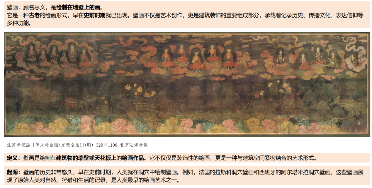 壁画的历史与文化传承:壁画艺术自史前时代起便作为一种重要的表达形式,见证了人类历史与文化的变迁。从古埃及的墓室壁画到中国的敦煌壁画,壁画不仅记录了宗教信仰、社会习俗,也承载了古人对美的追求。