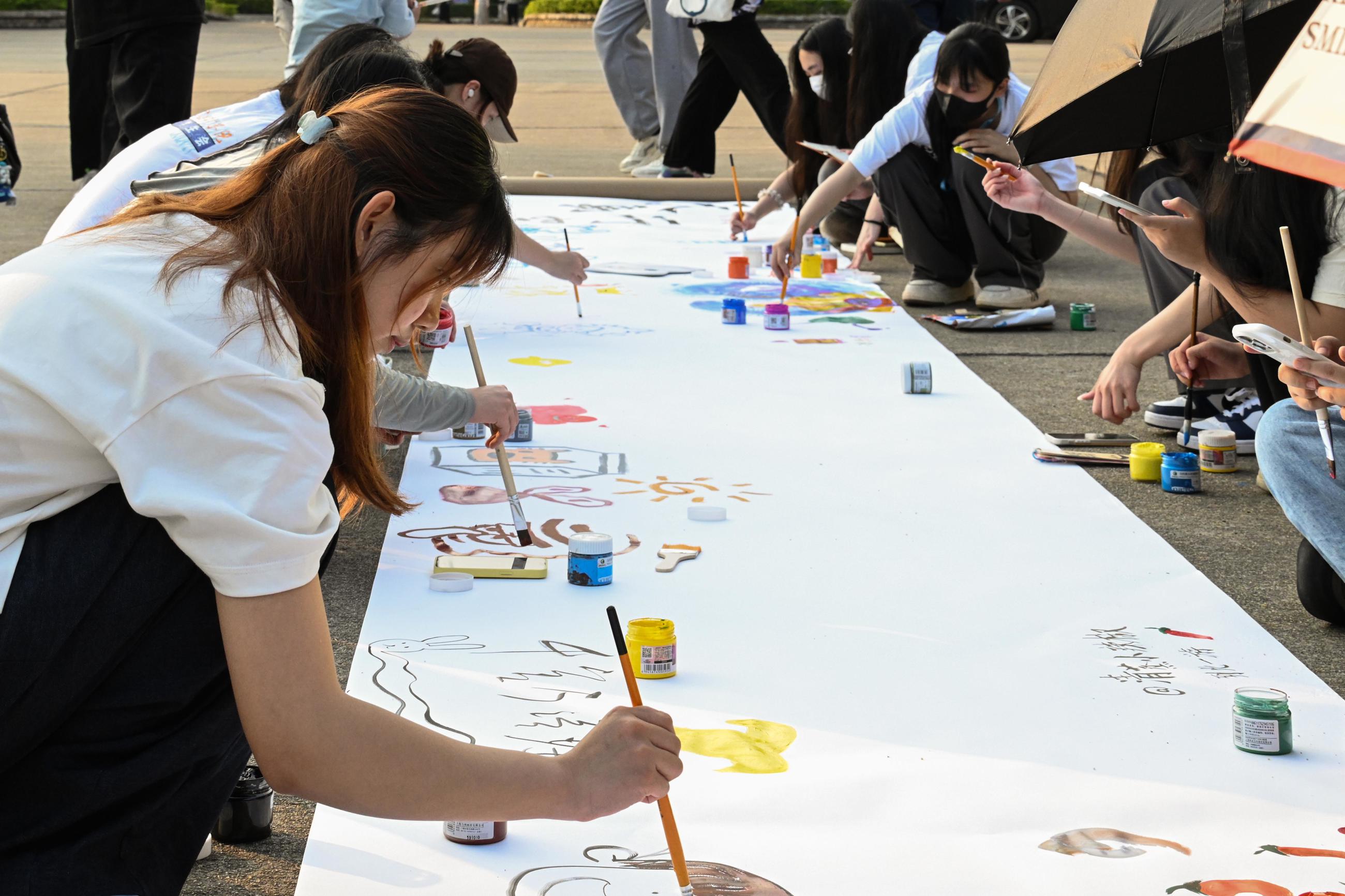 百人绘画活动现场中,同学们在三幅不同绘画主题1x10m的白纸上自由创作,用色彩描绘出青春的蓝图。在书画体验活动中,同学们挥毫泼墨,在笔墨中体会中华传统文化之美。