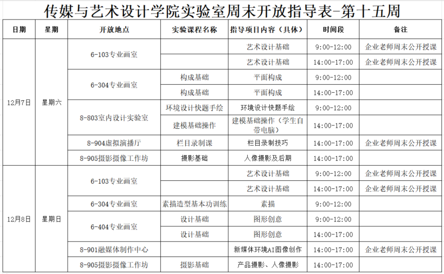 传艺实验室2024-2025第一学期第十五周周末开放安排 发布时间:2024-12-06 08:59:59 浏览次数: 次 【字体:小 大】 为提高学生的创新实践能力,更好地培养应用型人才,推进实验教学改革,传艺实验室将对学生进行课外开放,增加实验室的开放时间和开放内容,欢迎同学们到相关专业实验室学习。第十五周周末开放安排如下: 传媒与艺术设计学院 2024年12月06日 终审:传艺学部 分享到: 【打印正文】