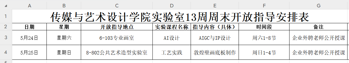 为了更好地满足广大学生利用课余时间进行专业学习和提高,丰富自己的创新实践能力的需要,传艺学部综合实验中心相关实验室将在课余时间对学生进行开放。现将2024-2025学年第二学期第13周周六、周日开放安排公示如下: