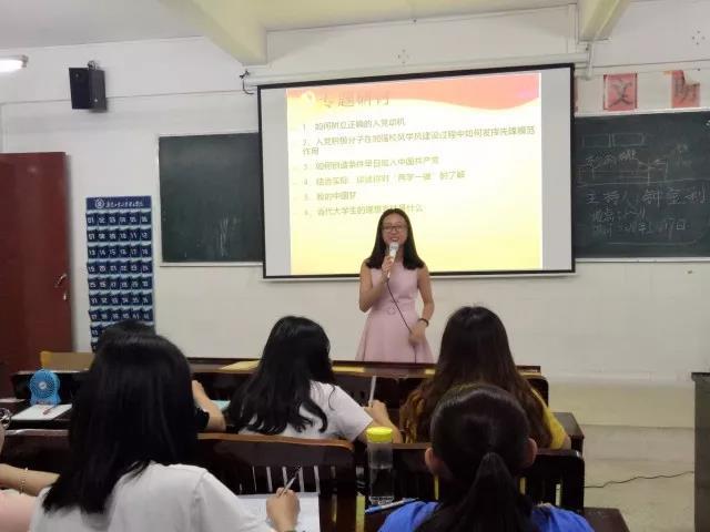 紧接着,党建办指导老师杜艺静发表了讲话,她指出,作为一名入党积极分子,应当深入了解“两学一做”,“两学一做”即指学党章党规,学系列讲话,做合格党员。就此她提出,希望在座能够珍惜学习的机会,争取早日发展为一名中共党员,保留现在的入党积极性,同时,她也指出在座的学员要在学习和参加校园活动上保持积极性,争做最优秀的人,并发挥先锋模范作用。