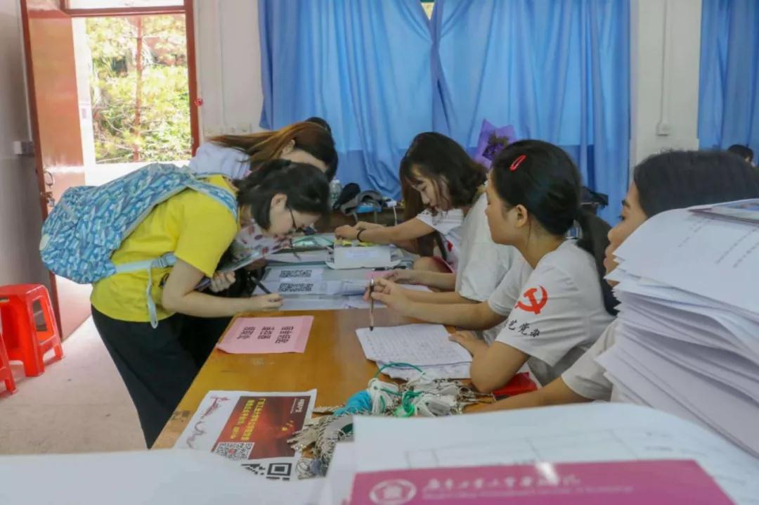 党员给新生登记资料,发放资料