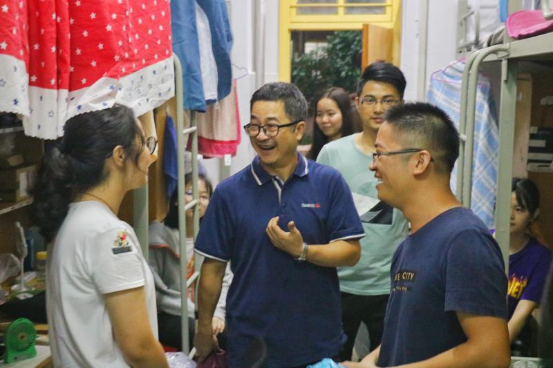 8月27日晚,大雨滂沱,为使新生更快、更好地适应新环境,及时解决新生入学过程中的各种问题,学部部长程东胜、党总支书记黄叔贤、团总支书记陈国斌和各学生干部不顾风雨,第一时间到新生寝室进行走访慰问,了解新生的情况。