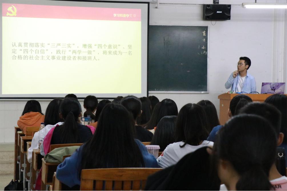 随后党员周倩怡同志也给学生们补充了关于十九大精神的相关内容并要求学生们了解,也分享了自己的成长经历,最后引用了十九大“不忘初心,砥砺前行”这一句话作为自己的经验总结同时也寄语在场的学生们。入党积极分子黄世杰同志向学生们讲述了自己在实习经历中所遇到的问题,并用“路是自己走出来的,生命高度是用双手丈量”“你只有非常努力,才能毫不费力”这些话语来激励学生实现自己的梦想,全场掌声不断。