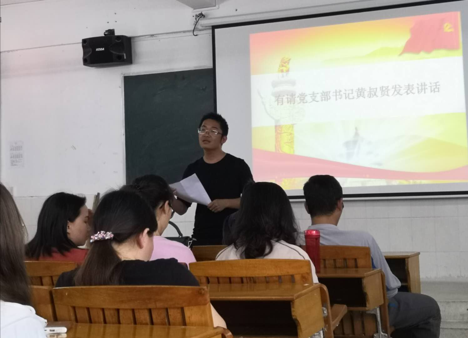 (殷倩倩老师讲话) 会议内容第二项,党总支书记黄叔贤进行讲话。书记讲述了下期党课的学习教育内容并强调要加强本党总支组织性、纪律性,增强党总支凝聚力。