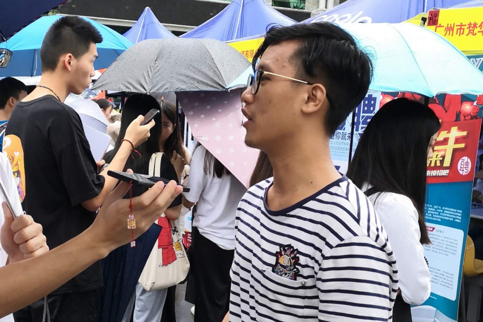 尽管当天天空中下着蒙蒙细雨,但仍然阻挡不了本次校园招聘会的如期进行。我们直击与传艺学院相关的各招聘单位前,看到准备面试的传艺学生都穿着讲究,拿着精心准备的应聘材料,穿梭于一个个企业摊位前,主动了解用人单位及岗位需求情况。