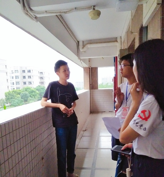首先到达党员宿舍后,党务助理开始问党员近期的状况以及平时的兴趣爱好,与宿友的相处情况,询问党员在学习与生活上的计划尤其是将要出去实习的党员。在此过程中总体上党员都积极配合并且表示理解和支持党建工作,党务助理们也强调党员们要严格遵守学校的规章制度不使用违禁电器,积极参加学校组织的定期清理教室卫生。