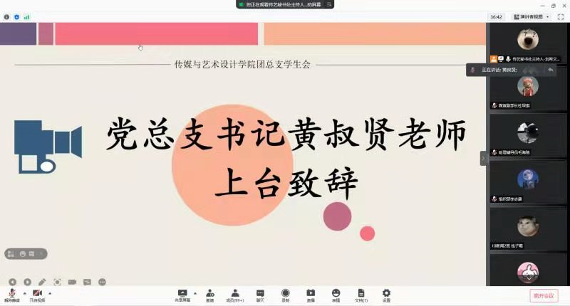 传媒与艺术设计学院党总支书记黄叔贤老师、团总支书记陈靖岚老师、学生党支部书记杨岩老师、易班指导老师殷倩倩老师、18级辅导员叶子老师、19级辅导员任怡静老师以及传艺学院各组织成员出席了本次大会。