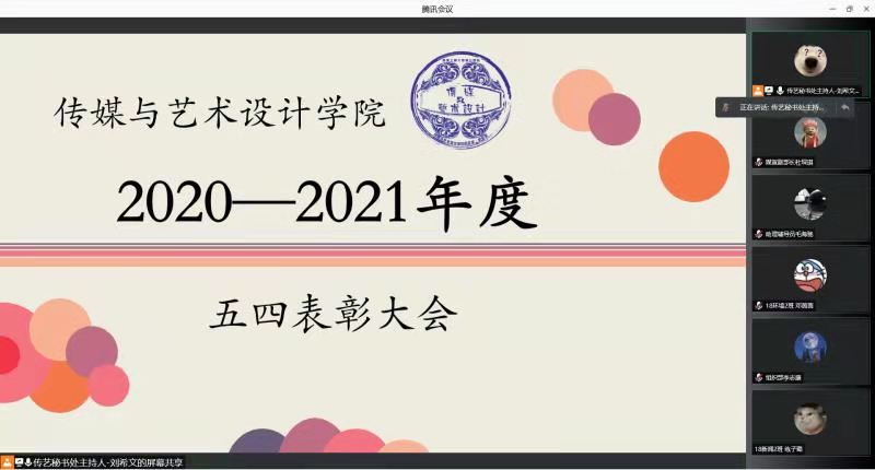 在迎接中国共产党成立100周年、纪念五四运动102周年之际,为表彰先进干部,激励更多团员青年奋发向上,推动传媒与艺术设计学院团总支学生会工作的顺利进行,2021年6月24日19:00,传媒与艺术设计学院在腾讯会议举办了2020-2021学年度五四表彰大会。