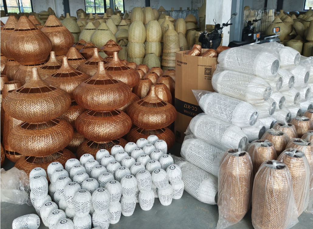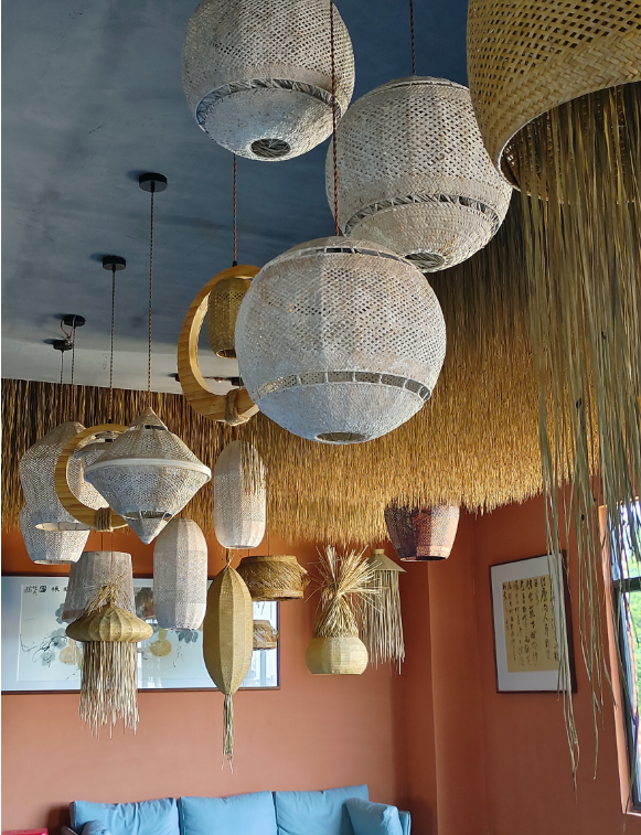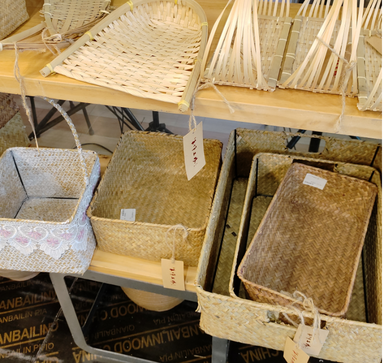 在一楼一侧以及二楼的展厅里,陈列着形形色色的蒲织品。从蒲箩筐、草席、蒲手袋、蒲纸盒、蒲储物盒、蒲包包、蒲帽子到蒲文件夹等各种生活用品,每一件作品都经过了精心的设计和制作。此外,还有各种精致漂亮的灯饰等数百种产品,让人目不暇接,流连忘返。