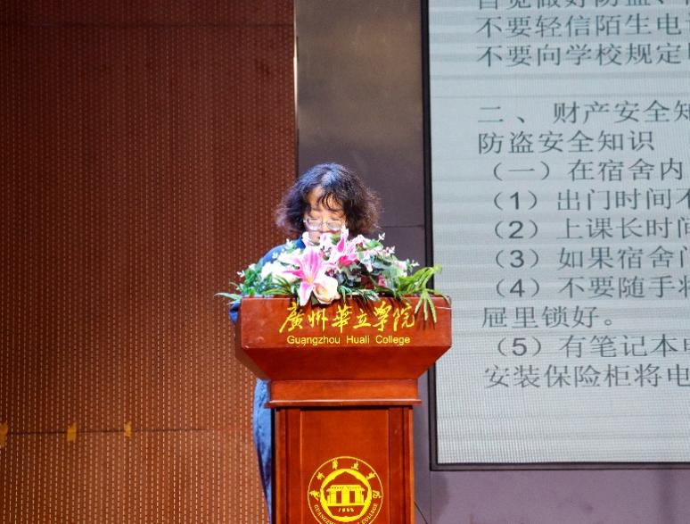 任怡静老师带领新生学习《广州华立学院开学安全第一课》,强调防范诈骗和个人安全的重要性。她要求新生们保存以下电话:保卫处24小时值班电话(020-82907656)、应急电话(18924130748)、以及增江派出所电话(020-82750999),遇到紧急事情及时拨打,以保障自我人身安全。