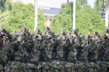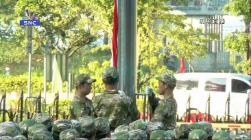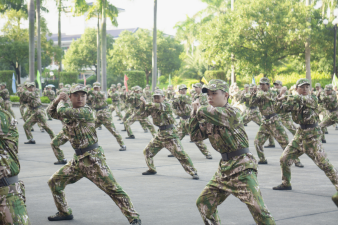 “家是最小国,国是千万家”全体军训学生用手语表演《国家》,歌唱声中传达出同学们对国家的赤诚之心,倾注浓厚的爱国情感。一句句“捍卫中国”的铮铮誓言回荡在校园,响彻云霄。
