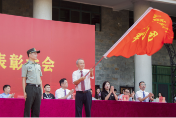 刘洁生校长向广州市越秀区人武部军训团赠送锦旗,表达衷心的感谢。最后由刘洁生校长接回军训团团旗。