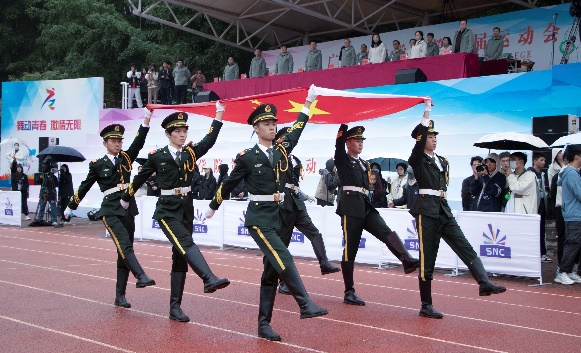 各方队依次展示结束后,国旗护卫队迈着铿锵有力的步伐,手举耀眼夺目的五星红旗走向国旗台,国歌奏响,国旗飘扬。全体同学肃然起敬,升国旗,奏唱国歌。