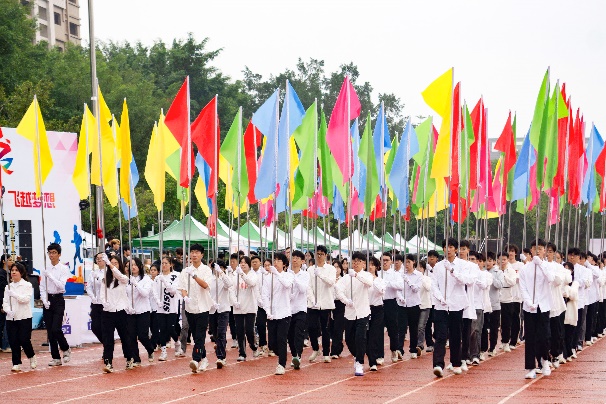 首先进行的是入场仪式,由各学院、社团代表组成的方阵队伍,他们手握飘扬的彩旗,伴随着音乐的节拍,朝气昂扬地从主席台前依次走过。