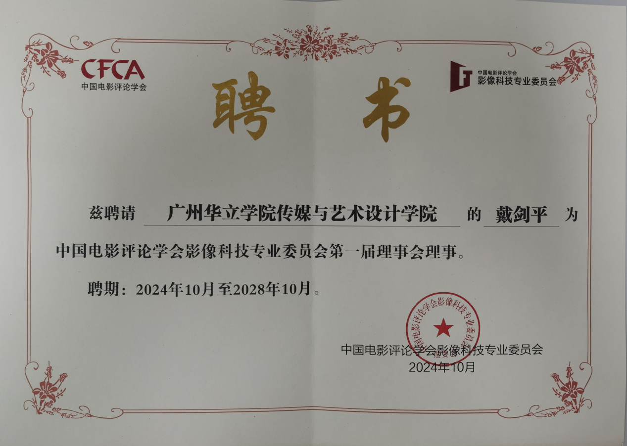 传艺学院院长戴剑平教授受聘为中国电影评论学会影像科技专业委员会理事