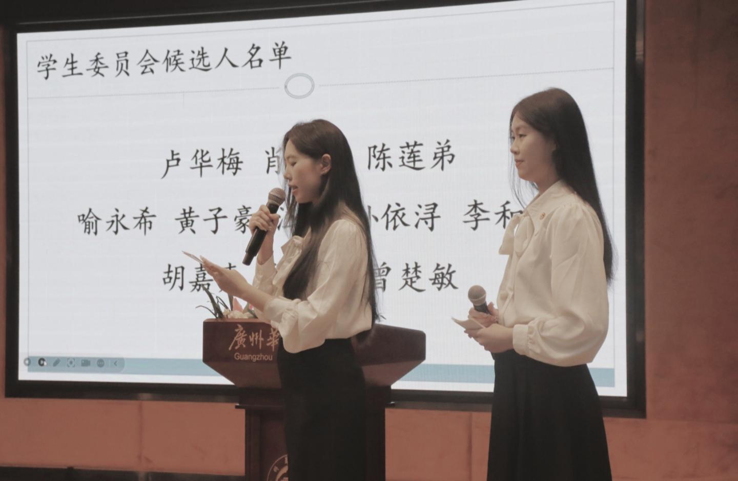 主持人宣读大会须知,刘嘉杰师兄宣读筹备大会工作报告、大会筹备委员名单并宣读、审议通过代表资格审查小组名单。陈超妍师姐宣读、审议通过大会总监票员、监票员、计票员名单。肖悦彤师姐宣读大会代表资格审查报告。吕芷莹师姐宣读、审核通过大会选举办法。