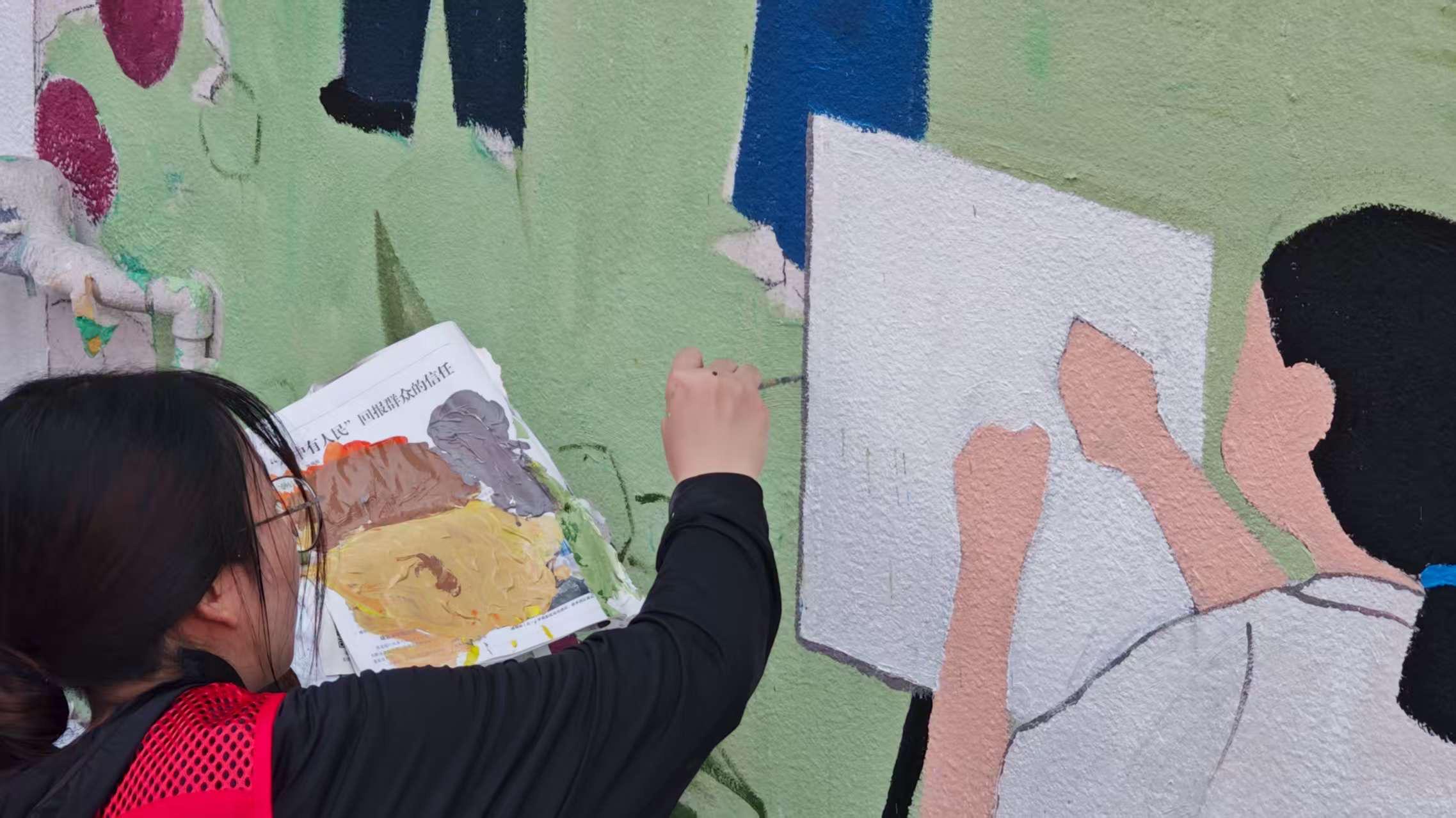 当晨曦再次洒向沙角的街巷,墙势出击队和墙势来袭队的画笔已在晨光中落下。继昨日勾勒出轮廓后,实践队员们接续“精工细作”的匠心,让龙舟竞渡的浪花、荔枝树的叶脉、塔楼的飞檐在墙面上逐渐清晰。截至当日傍晚,主墙面完成度超过70%,传统文化元素在光影交错间“活”了起来。