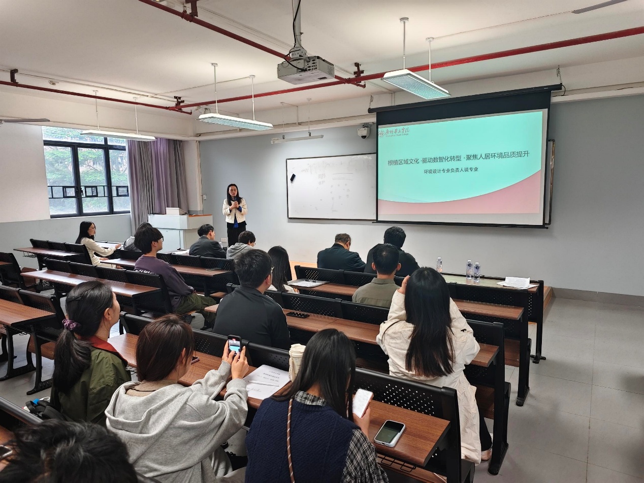随后,环境设计专业负责人邱悦副教授以“根植区域文化、驱动数智化转型、聚焦人居环境品质提升”为导向,分享专业建设路径。她介绍,面对设计行业数智化变革趋势,专业确立“培养懂文化传承、善技术应用、能解决复杂空间问题的创新应用型人才”目标,构建“一体两翼、跨界融合”培养规格——以环境设计本体知识为核心,以人文地域素养、数智技术应用为两翼,实现跨学科能力整合。课程体系采用OBE成果导向理念反向设计,通过“通识基础—学科基础—专业核心—实践拓展”四层结构,深度融合区域文化、数智技术、人居环境三大模块,确保人才能力精准匹配需求。
