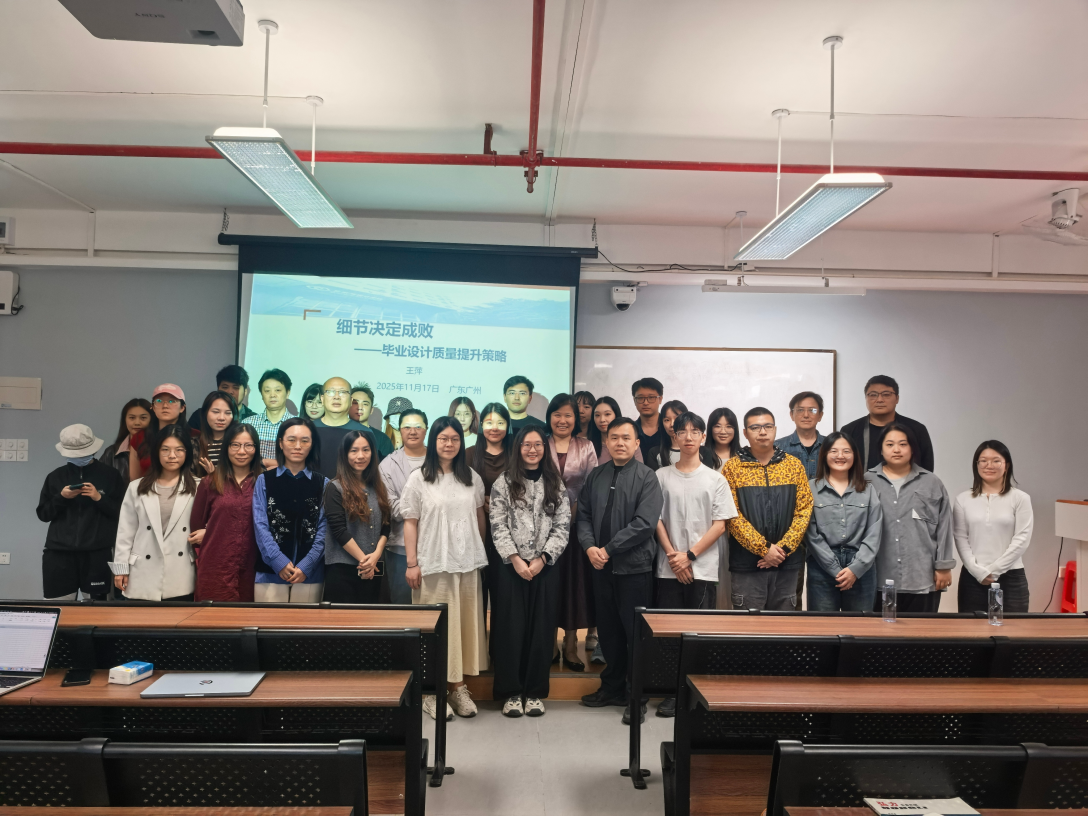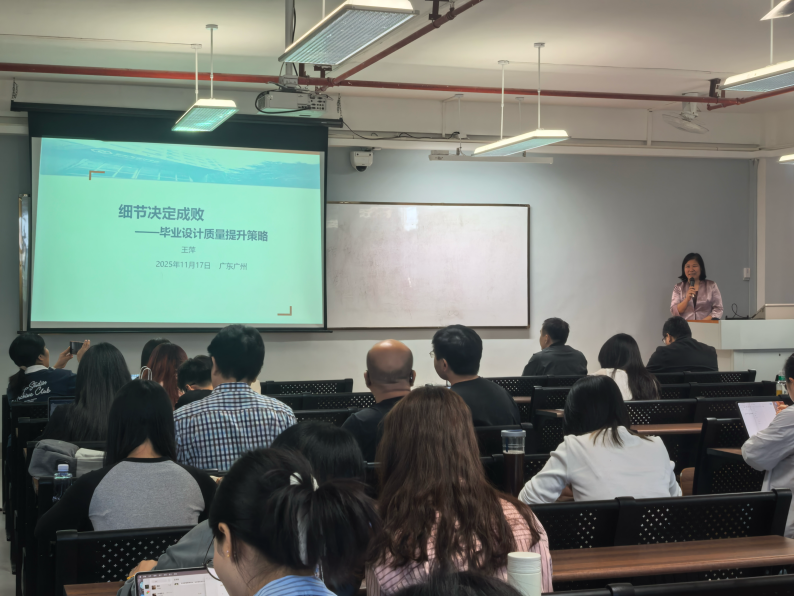 11月17日上午,广东工业大学王萍教授应邀在广州华立学院6-601教室开展“细节决定成败——毕业设计质量提升策略”专题讲座。新艺术与设计学院环境设计系、视觉传达设计系教师参加学习。