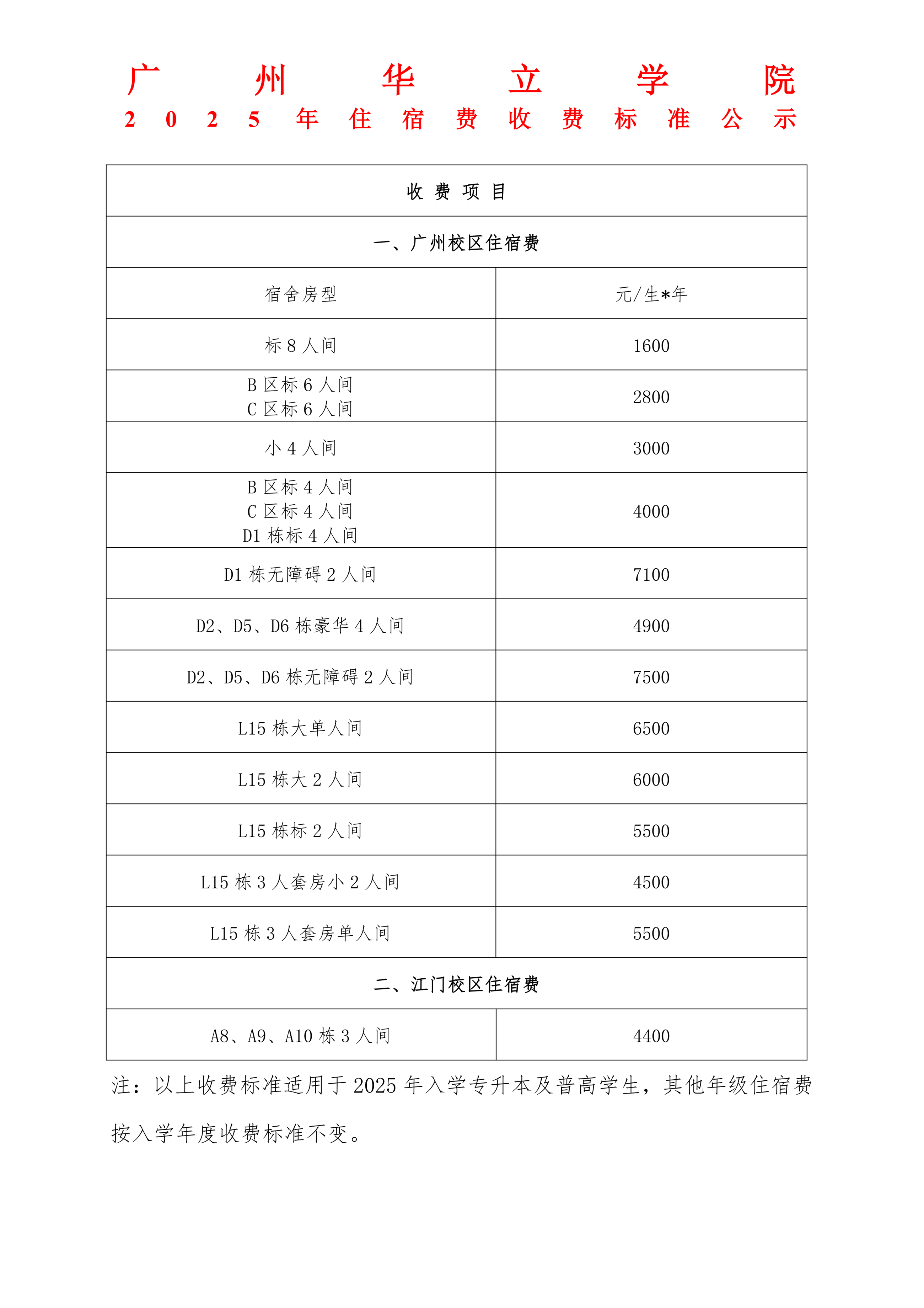 广州华立学院2025年住宿费收费标准公示