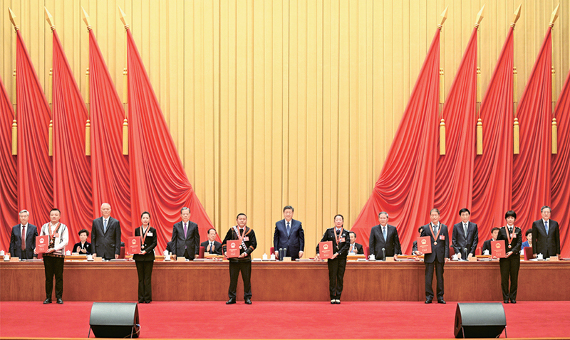 2024年9月27日,全国民族团结进步表彰大会在北京举行。这是习近平等为受表彰的模范个人和模范集体代表颁奖。 新华社记者 李学仁/摄