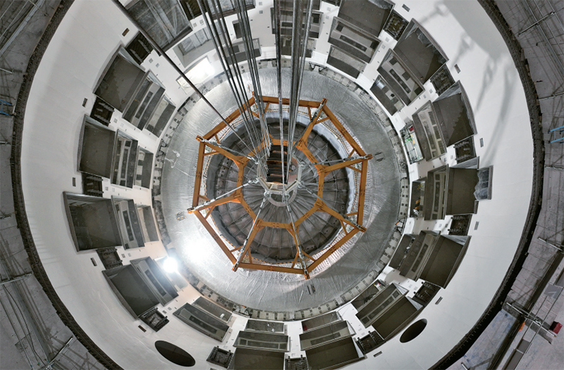 2025年10月1日上午,位于安徽合肥未来大科学城的紧凑型聚变能实验装置(BEST)主机首个关键部件——杜瓦底座成功落位安装,标志着项目主体工程建设步入新阶段。该装置建设的稳步推进,对于我国率先开展前沿聚变科学研究、验证未来聚变堆关键技术、持续引领国际聚变能发展具有重大战略意义。图为在装置建设现场拍摄的杜瓦底座(无人机照片)。 新华社记者 周牧/摄