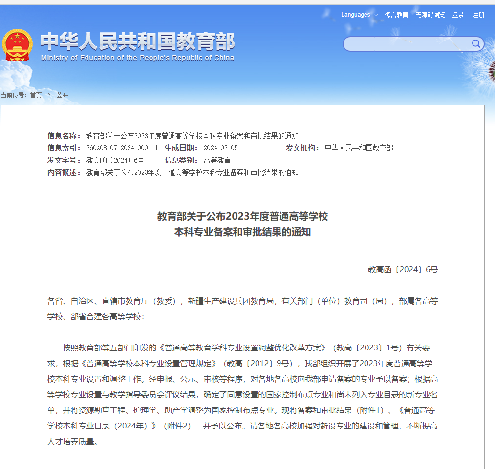 5、教育部关于公布2023年度普通高等学校本科专业备案和审批结果的通知