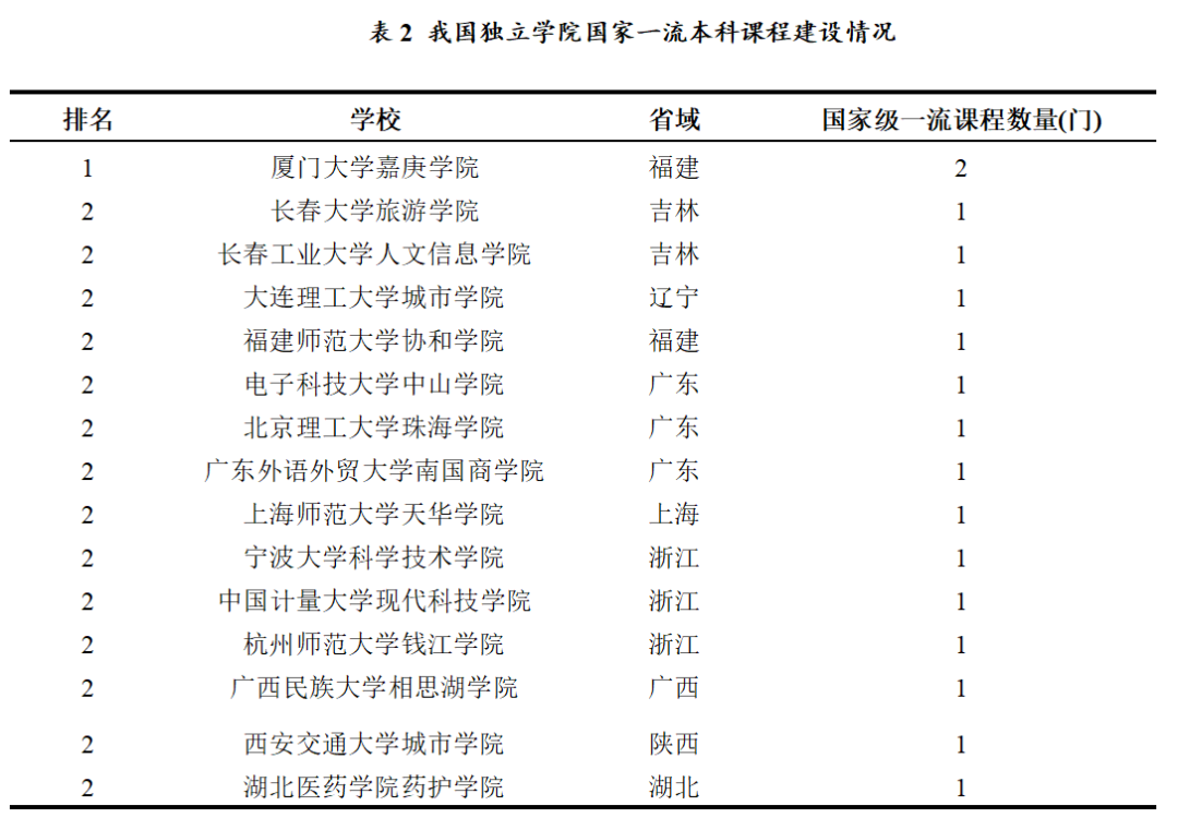 在第二批国家级一流本科课程认定中,全国共有15所独立学院获批,共计16门,校均1门,有144所独立学院未获批国家一流课程。表2列出了拥有国家一流课程的独立学院(部分高校并列)。厦门大学嘉庚学院获批2门国家一流课程,其余14所独立学院均获批1门国家一流课程。