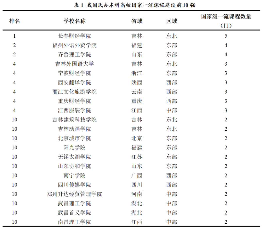 一流本科课程建设数量是衡量一所高校办学水平的重要指标之一。在第二批国家级一流本科课程认定中,全国共有74所民办本科高校获批国家一流课程,共计109门,校均1.47门,有335所民办本科高校未获批国家一流课程。表1列出了国家一流课程建设数量较多的民办高校(部分高校并列),其中,长春财经学院、福州外语外贸学院、齐鲁理工学院、吉林外国语大学、宁波财经学院、西安翻译学院、丽江文化旅游学院、重庆财经学院、江西服装学院等高校的国家一流课程较多。