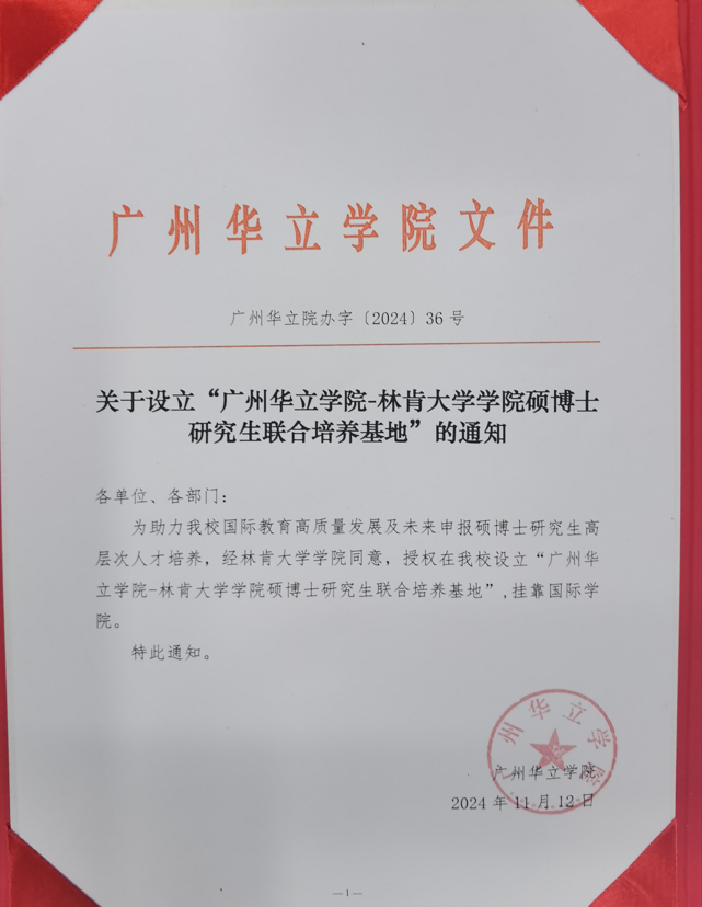 喜报--广州华立学院-林肯大学学院硕博士研究生联合培养基地落户国际学院