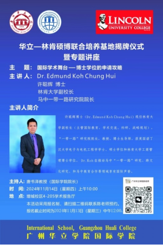 2024年11月14日上午,学校在第四教学楼205学术报告厅举行了“广州华立学院-马来西亚林肯大学学院硕博士研究生联合培养基地(Guangzhou Huali College-Lincoln University College Joint Training Base for Master and PhD)”(简称“联培基地”)成立揭牌活动。林肯大学学院校长Amiya Bhaumik教授率代表团专程从马来西亚莅临活动现场。广州华立学院校长刘洁生教授,科研处处长李有红,传媒与艺术设计学院院长戴剑平教授,国际学院院长唐书泽教授,机电工程学院院长何益宏教授,外国语学院院长蔡荣寿教授,药学院院长王培席教授及师生代表120余人共同出席“联培基地”成立揭牌活动。活动由国际学院谭敏莹老师主持。