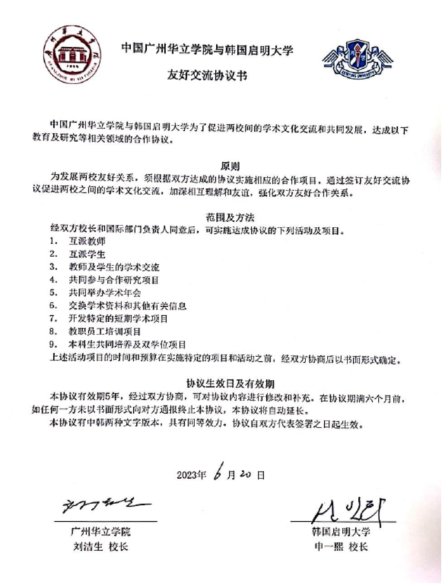 2023年6月与广州华立学院签订友好交流学校协议是,有效期5年。