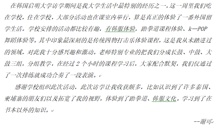 暑期访学内容主要包括大学介绍及校园观光,与其他国家学生共享启明大学体验,韩国文化课(茶道及韩服课、韩国传统音乐课(四物游戏)、韩国传统武术课(跆拳道)、K-POP舞蹈课和韩文书法课等),现场体验与观光(参观大邱城市、游览E-WORLD游乐园、庆州或釜山市以及参观现代汽车蔚山工厂)。