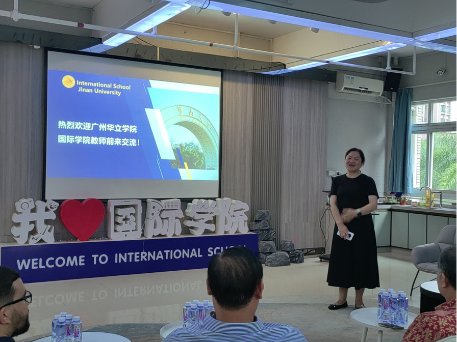 宋京松首先对来自广州华立学院国际学院教师的到访表示欢迎,她简要介绍了暨大国际学院24年的全英语教学发展历史、办学规模和层次、港澳台华侨华人以及外国留学生规模、办学特色和成果以及国内外影响,并播放了暨南大学海内外毕业学生对全英语教学模式的体验和感受以及成功的视频。