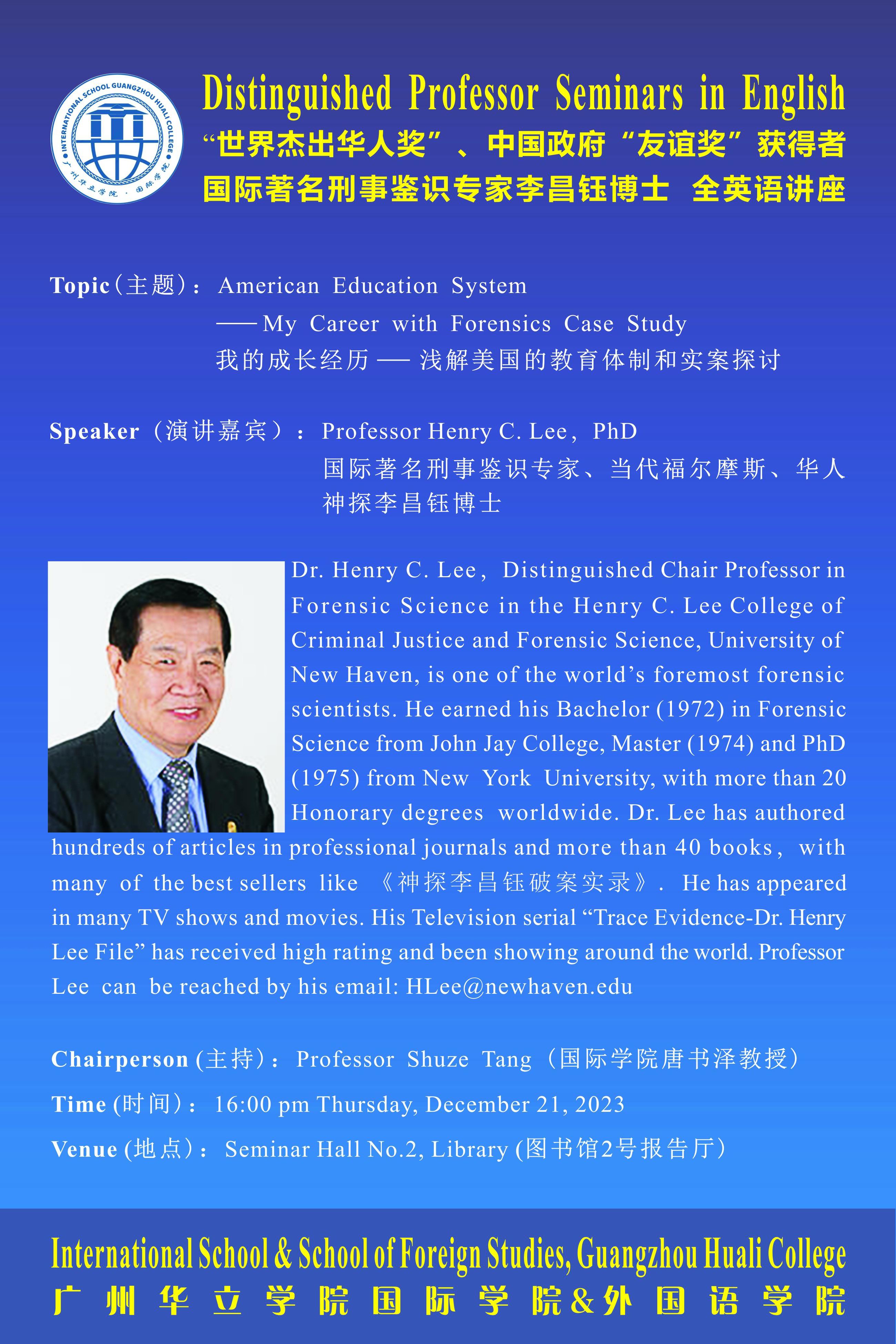 广州华立学院国际学院邀请国际著名刑事鉴识专家李昌钰博士来校讲座