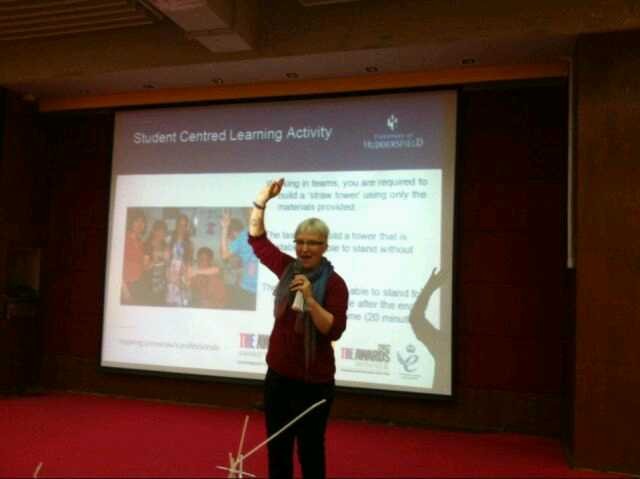 讲座的过程中,Lyn Hall教授把在座的同学每10人分为一组,并为每组分配两包塑料吸管,规定学生们在5分钟内用塑料吸管摆成一座塔。经过同学们的团队交流与合作,一座座塔已经完成。比赛结束后,Lyn Hall教授为制造最高塔的团队赠送了小礼物。游戏虽小,意义非凡,Lyn Hall教授在告诉同学们团队合作精神和沟通交流重要性的同时,也展示了一种全新的教学方式。
