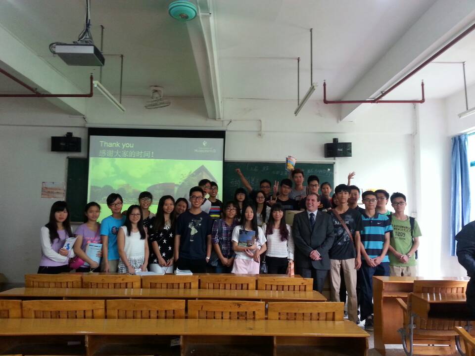 2014年10月25日上午,哈德斯菲尔德大学(以下简称“哈大”)商学院的导师Wayne Fiddle及从哈大留学归来的Oliver老师莅临我院,国际交流中心刘主任热情接待。为了让同学们更加了解哈大的情况和双学位项目的实施,同日,在我院3号教学楼301多媒体教室成功召开了交流宣讲会。全院学生积极参与。