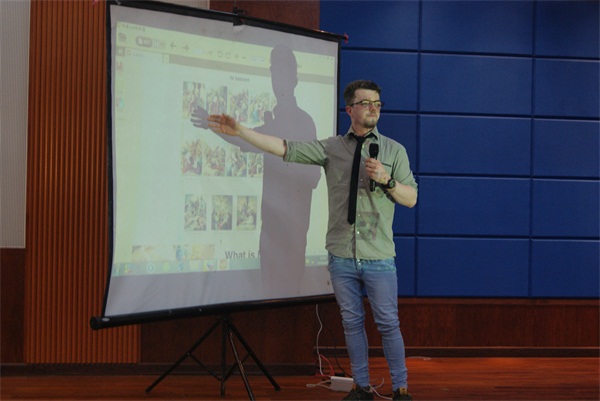 外教Saul Higgins 全程用英语与学生交流,首先,Saul Higgins通过PPT给在场的学生讲述了复活节的解复活节的历史缘由、时间、庆祝方法。接着进入有奖竞答环节,Saul Higgins给在场的学生提问,学生们积极抢答,回答正确的同学还可以收到外教Saul Higgins亲自送上的精美礼物----哈德斯菲尔德大学勋章。
