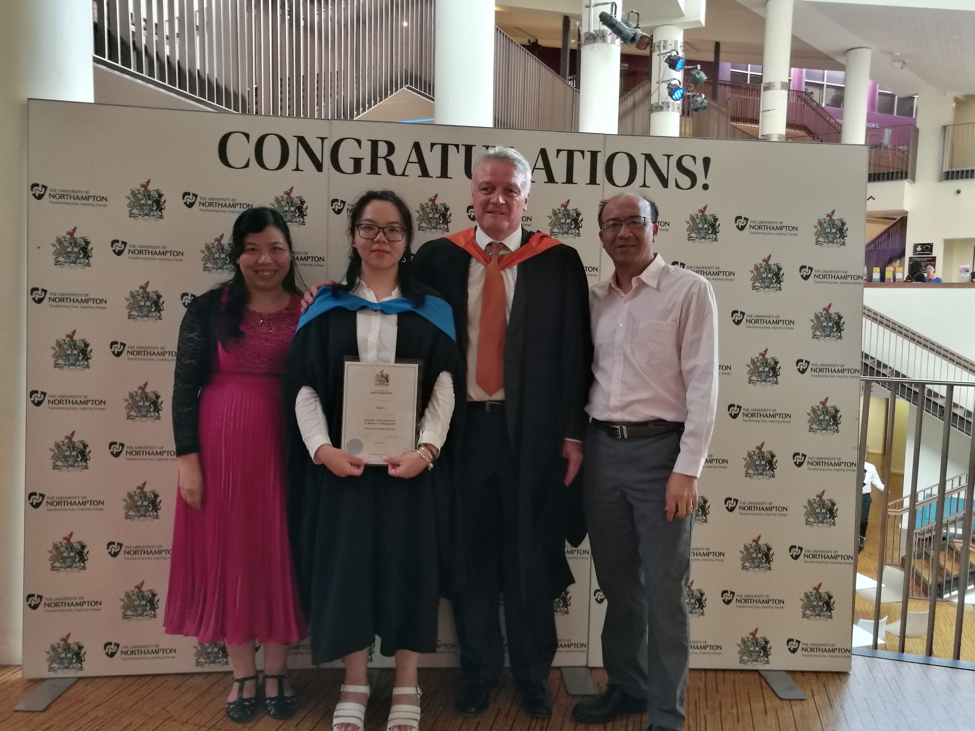 毕业典礼在Royal Dengate Theatre进行,北安普顿市长及夫人热情接待了来访嘉宾。7月18日下午17:30分,商学院毕业典礼按时进行,北安普顿大学校长、各学院院长及教授依次进场就坐。北安普顿大学校长Nick Pertford博士致辞,接着由曾到访我院的商学院院长Mairi Wason教授宣读毕业生姓名,逐一上台接受学位授予。现场气氛热烈,不时传来亲友团的欢呼声和掌声。