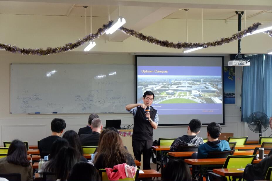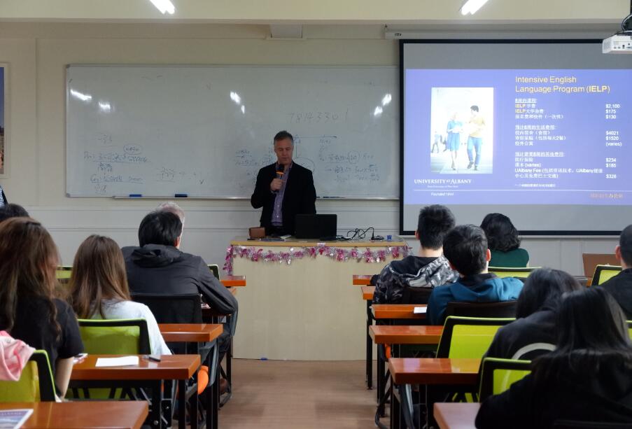 首先Dr.Mike Elliot表示很开心有这个机会能和国际班的同学交流,随后跟同学们介绍了奥尔巴尼大学的概况,奥尔巴尼大学坐落在纽约州的首府奥尔巴尼市,建于1844年,是一所研究型的公立大学,是纽约州立大学系统最古老的大学之一。简单的概况之后,Dr.Mike Elliot还向大家介绍了国际学生们的风采,并表示欢迎同学们报读。