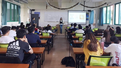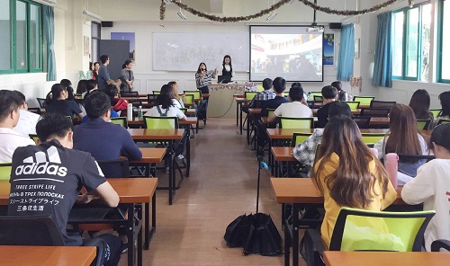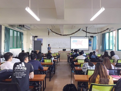图为美国德州卫斯理大学代表向同学们介绍美国德州卫斯理大学